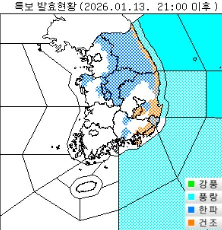 기상청은 13일 오후 9시를 기해 진주·합천·사천에 한파주의보를 발효했다.