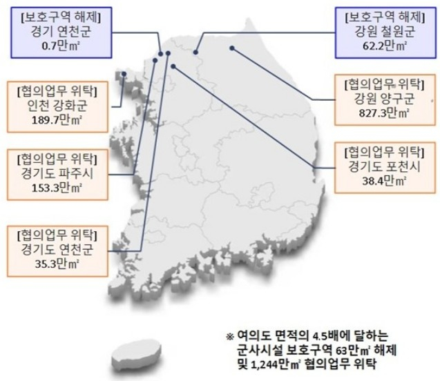이와 함께 합동참모본부는 지난해 12월 19일 접경지역 보호구역 약 1244만㎡에 대해 건축·개발 인허가 시 관할부대와의 협의 업무를 지방정부에 위탁하기로 승인했다. 이에 따라 군이 사전에 지정한 높이 이하의 건축물은 보호구역 해제와 유사하게 군 협의 없이 추진할 수 있게 됐다.