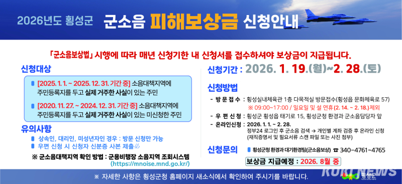 횡성군은 오는 19일부터 내달 28일까지 ‘2026년 군용기 소음피해 보상금’ 신청을 접수한다고 14일 밝혔다.