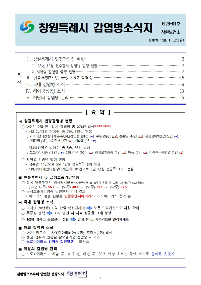 이번 감염병 소식지에는 창원특례시 법정감염병 현황을 비롯해 지역별 감염병 발생 동향, 인플루엔자와 급성 호흡기 감염증 현황, 국내·외 주요 감염병 소식, 이달의 감염병 관리 정보 등이 담겼다.