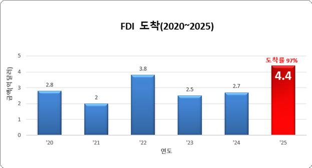 부산진해경제자유구역청은 2025년 FDI 신고액이 4억5300만 달러로 연간 목표(1억8000만 달러)의 252%를 달성했다. 특히 도착 기준 FDI는 4억4100만 달러로 도착률 97%를 기록했다. 이는 최근 6년 평균(82%)은 물론 전국 경제자유구역 평균(44%)을 크게 웃도는 수치다.