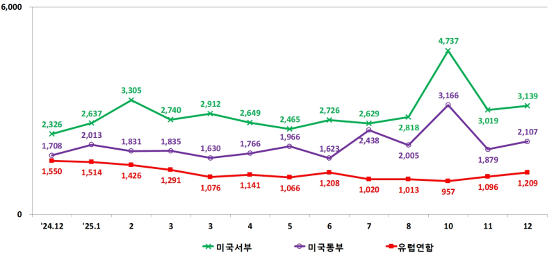 미국은 서부 4.0%, 동부 12.1% 각각 상승했고, EU는 10.3% 오르며 두 달 연속 올랐다.