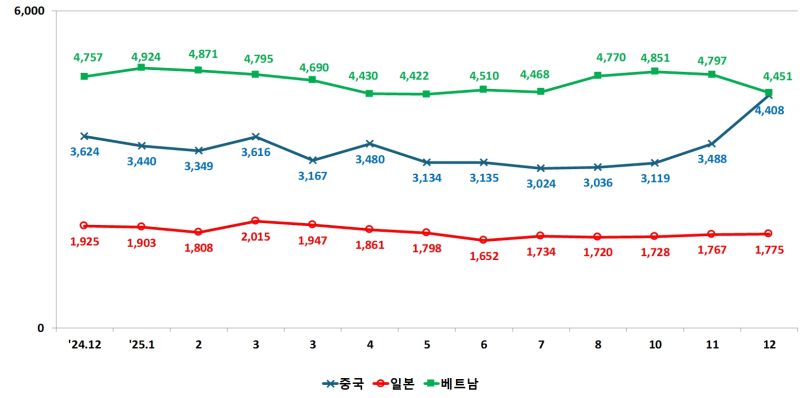 반면 일본은 5.8% 하락했고, 베트남은 4개월 연속 하락하며 100만 2000원까지 내렸다.