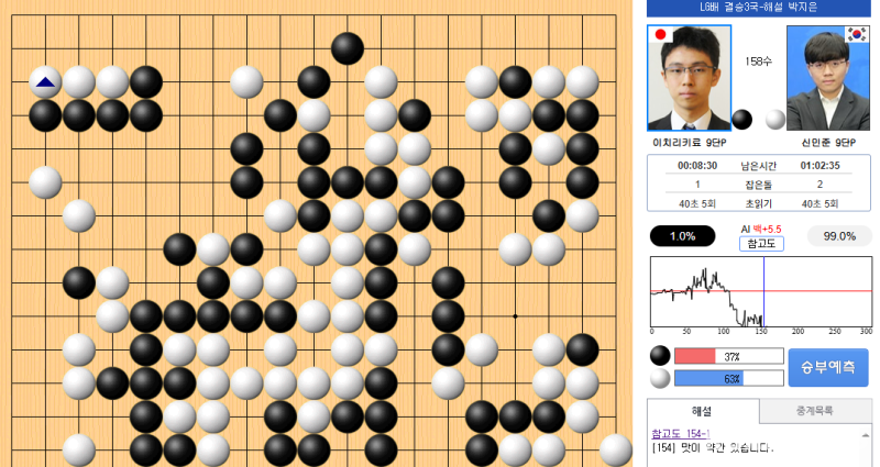 ‘스승’ 이세돌 9단의 응원이 힘이 됐을까. 이세돌 9단의 제자 신민준 9단이 LG배 우승 8부 능선을 넘었다. 신 9단은 오후 3시5분 현재 인공지능 승률 99%를 돌파했다.