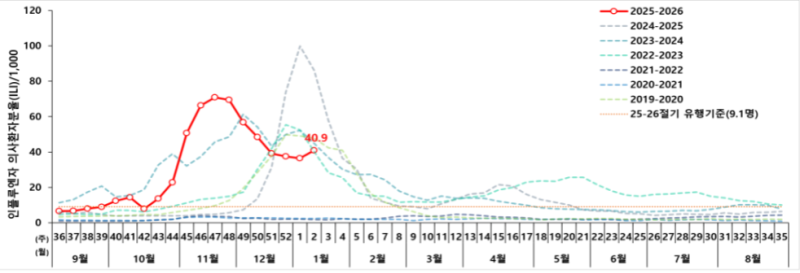 질병관리청에 따르면 의원급 의료기관의 인플루엔자 의사환자 분율은 지난해 11월 중순 이후 감소 추세를 보였으나, 올해 2주차(1월 4~10일)에는 외래환자 1000명당 40.9명으로 전주(36.4명)보다 소폭 증가했다. 이는 이번 절기 인플루엔자 유행 기준인 9.1명을 크게 웃도는 수준으로, 유행이 지속되고 있는 상황이다.
