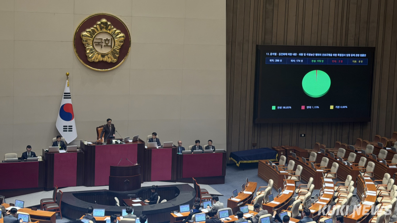 국회는 16일 오후 서울 여의도 국회에서 열린 본회의에서 민주당이 발의한 ‘윤석열·김건희에 의한 내란·외환 및 국정농단 행위의 진상 규명을 위한 특검 임명 등에 관한 법률안’을 가결했다. 국민의힘과 개혁신당은 법안 상정 직후 필리버스터(무제한 토론)에 돌입했지만, 민주당을 비롯한 범여권이 종결 동의안을 의결하면서 토론은 24시간 만에 종료됐다.