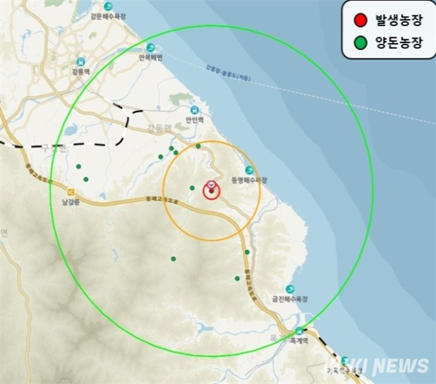 강릉 양돈농장 아프리카돼지열병(ASF) 방역대 (그래픽=강원특별자치도)
