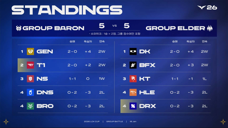 그룹 대항전으로 진행되는 LCK컵 1주 차는 바론 그룹과 장로 그룹 모두 상위권이 빠르게 형성되며 초반 판도가 드러났다. 그룹 간 성적은 5승5패로 균형을 이뤘다.