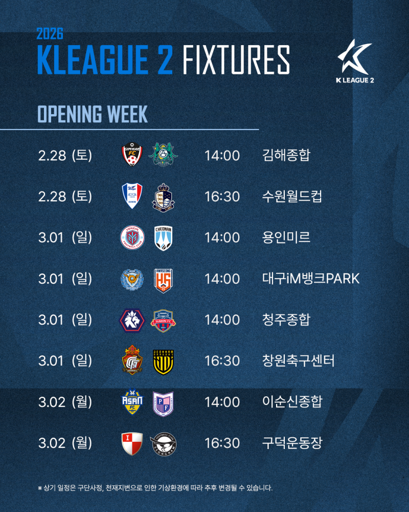 한국프로축구연맹은 19일 2026시즌 K리그2 정규시즌 1라운드부터 34라운드까지의 일정을 발표했다. K리그2는 새롭게 합류한 김해, 용인, 파주를 포함해 총 17개 팀이 참가하며 정규라운드는 팀당 32경기씩 총 272경기를 치른다.