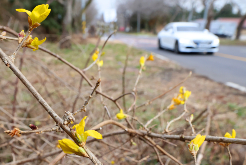 일년 중 가장 춥다는 대한을 하루 앞둔 19일 오전 제주시 오라동의 한 도로에 개나리꽃이 피어있다.