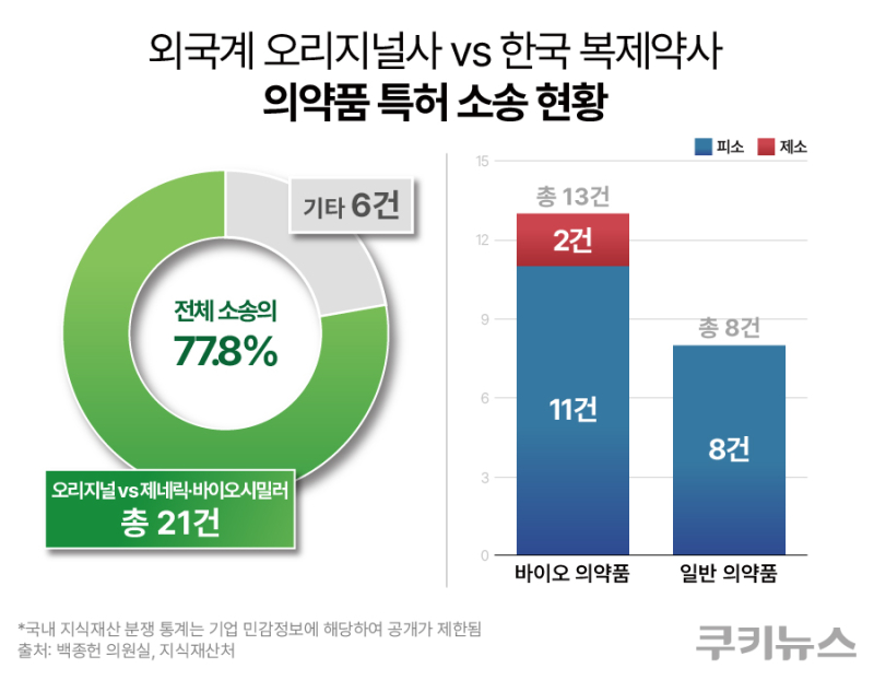 19일 쿠키뉴스가 백종헌 국민의힘 의원실을 통해 입수한 지식재산처 자료에 따르면 2016년부터 2025년 11월까지 최근 10년간 미국에서 발생한 외국 기업과 한국 기업 간 의약품 분야 특허소송은 총 27건으로 집계됐다. 이 가운데 오리지널 제품 특허를 보유한 다국적 제약사와 제네릭·바이오시밀러를 개발하는 한국 회사 간 의약품 분야 특허 소송은 총 21건이다. 제네릭 관련 소송은 8건, 바이오시밀러 관련 소송은 13건이었다.