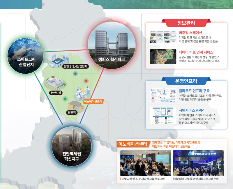 시는 연말까지 천안시 거점형 스마트도시 조성사업을 추진하고 M-AX(제조업 AI 전환) 클러스터, 중부권 데이터센터 등 국책사업에 선제 대응한다. 시는 융복합 스마트 기술로 기업 지원과 공간 구조를 결합한 거점형 스마트도시를 조성하고, 이를 바탕으로 국토교통부의 스마트도시 인증을 획득할 계획이다.