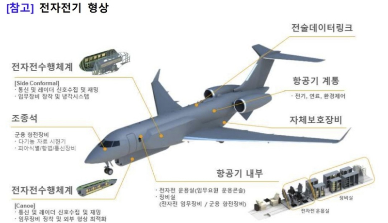 기체는 외국산 중형 민항기를 기반으로 개조해 사용하며, 전자전 임무 장비는 국내 기술로 개발·탑재된다. 방사청은 이를 통해 우리 공중전력의 생존성과 합동작전 수행 능력이 획기적으로 향상될 것으로 기대하고 있다.
