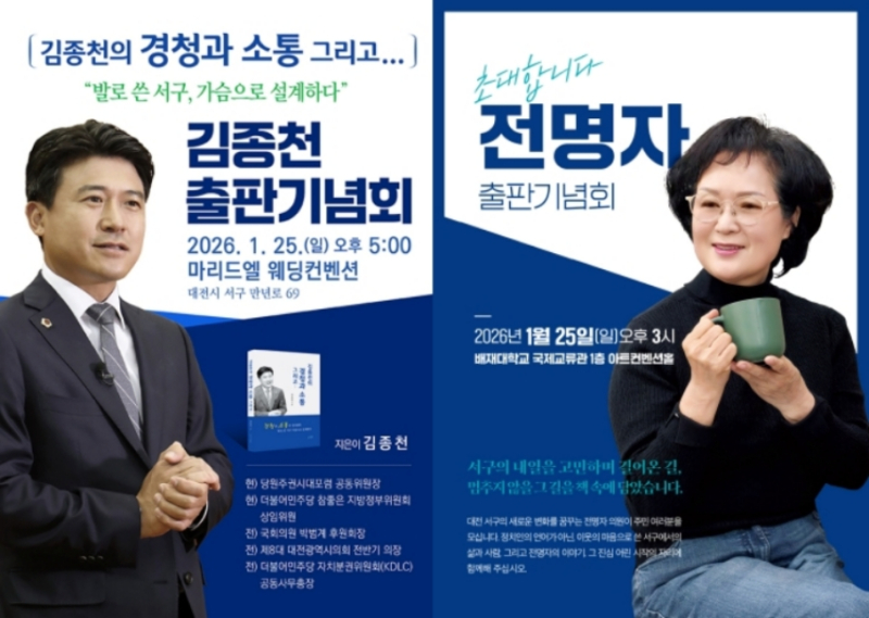먼저 전명자 전 서구의장이 오는 25일 오후 3시 배재대학교 국제교류관 아트컨벤션홀에서 그동안의 의정 철학과 삶의 기록을 담은 저서 '멈출 수 없는 길' 출판기념회를 개최한다.