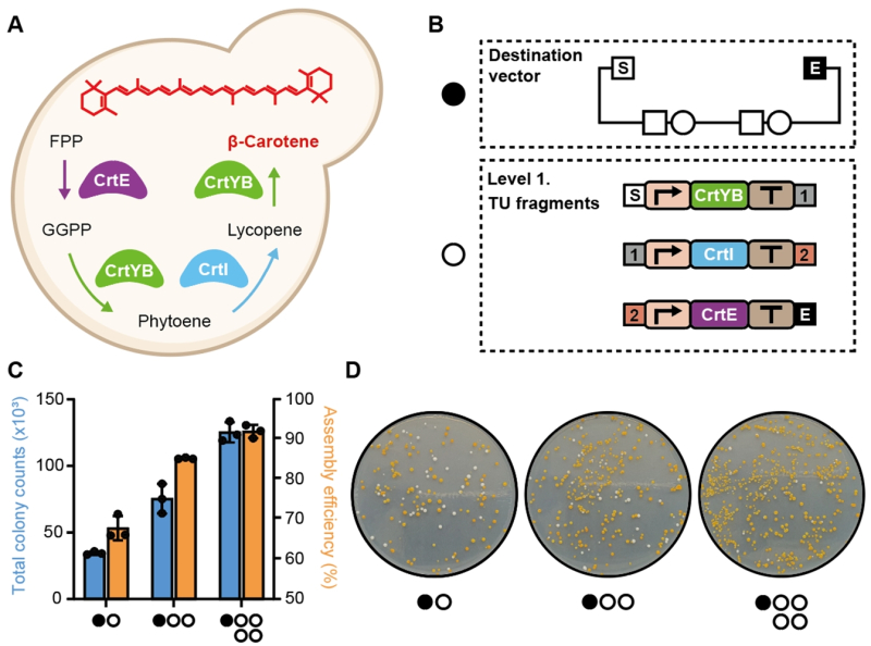 연구팀은 골든 게이트 조립으로 TU 단편을 만든 뒤 이를 효모에 넣어 한 번에 큰 구조체인 ‘다중 유전자 경로’를 완성하는 방식으로 공정을 단순화했다.