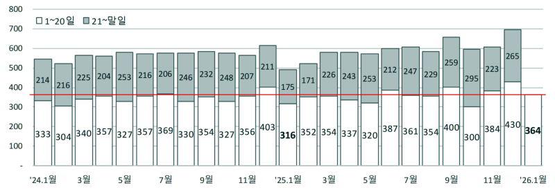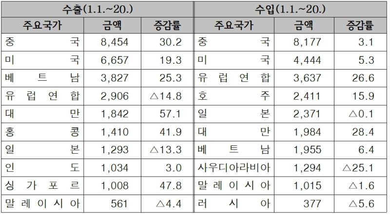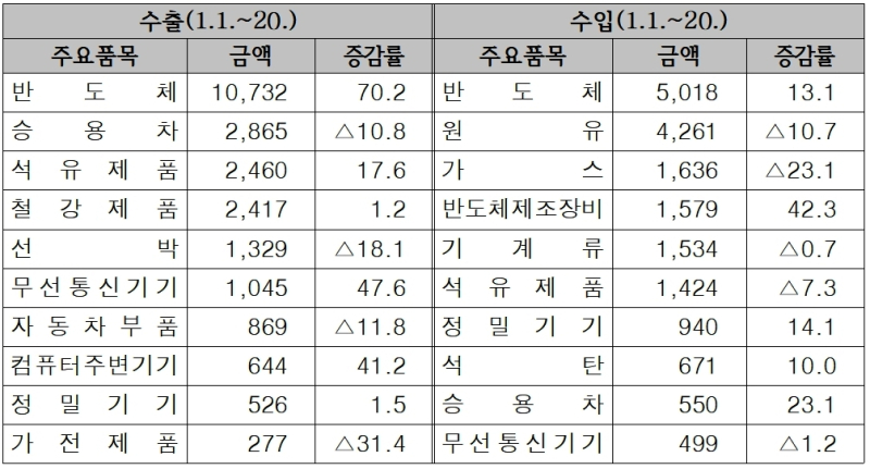관세청이 21일 발표한 ‘2026년 1월 1일부터 20일까지 수출입 현황(잠정치)'에 따르면 이 기간 수출은 364억 달러, 수입은 370억 달러로, 무역수지는 6억 달러 적자로 나타났다.