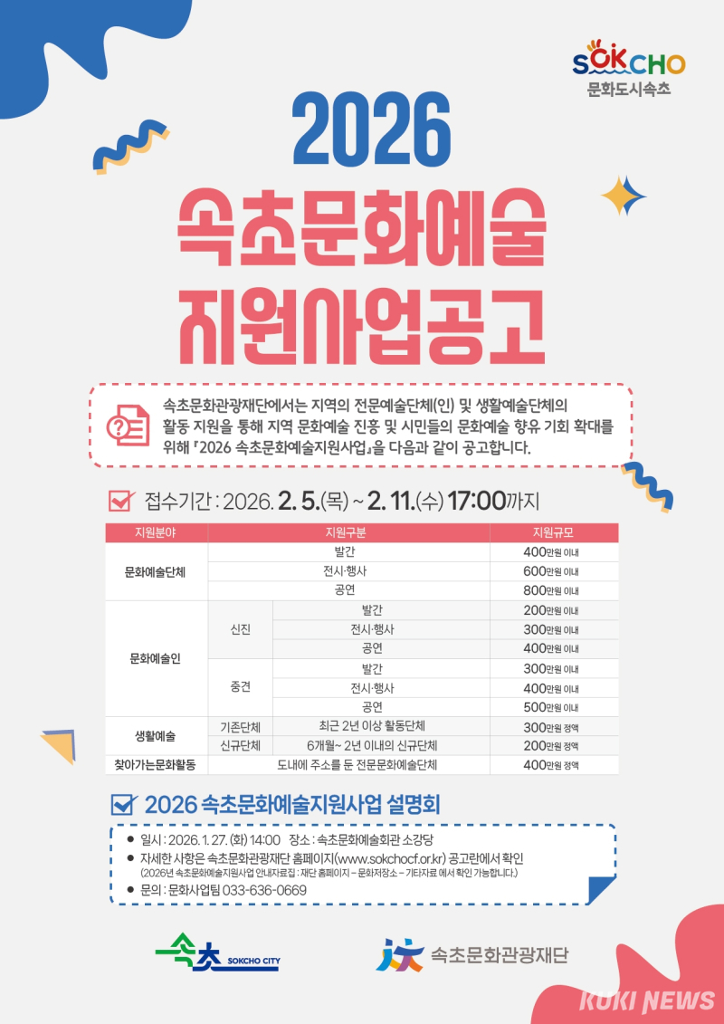 한편 속초문화관광재단은 문화예술인의 사업 이해도를 높이기 위해 27일 오후 2시 속초문화예술회관 별관 소강당에서 2026 속초문화예술지원사업 설명회를 연다.