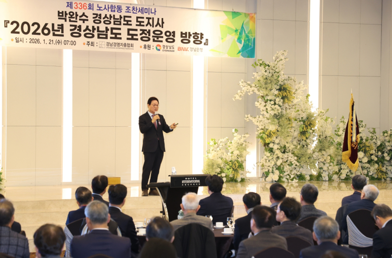 경남도는 21일 창원 인터내셔널호텔에서 열린 ‘제336회 노사합동 조찬세미나’에서 미래 도정 비전과 핵심 정책을 설명했다. 이날 세미나는 경남경영자총협회 주관으로 열렸으며, 경영계와 노동계 대표 등 250여 명이 참석했다.