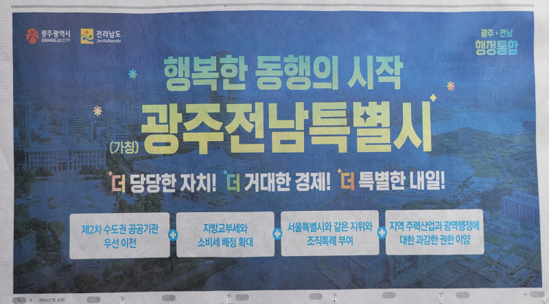 늦게 출발한 광주·전남에서 통합 논의가 더 빠르게 진행되고 있다. 두 단체장이 같은 민주당인 이유도 있겠지만, 지역 성장이 더 절실하기 때문이다. 그들은 21일 중앙언론에 광고를 내며 벌써 주민 및 대국민 홍보전에 나섰다. '광주전남특별시'로 명칭 합의도 어느정도 이룬 듯하다. / 천안·아산 선임기자