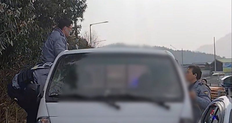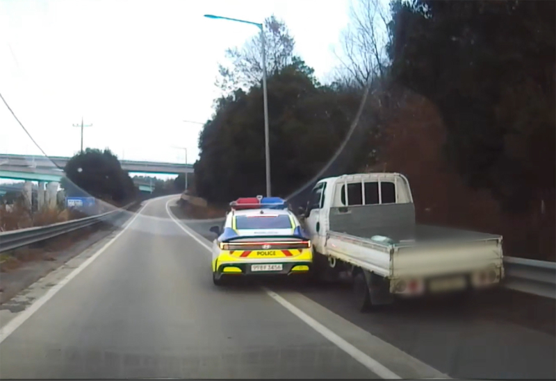 전남경찰청이 공개한 1분 14초 분량 영상에는 가드레일을 충격하는 등 위험하게 주행 중인 1톤 화물차를 순찰차가 추격 끝에 가로막아 정차시키고 운전자를 구조하는 과정이 담겼다.
