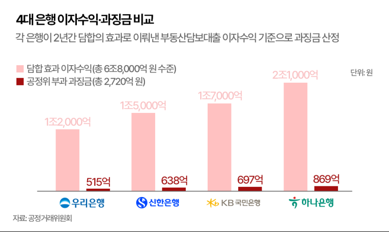 앞서 공정위는 4대 시중은행에 대해 LTV 정보를 교환하고 시장 경쟁을 제한한 행위에 대해 법 위반행위 금지명령과 함께 2720억원의 과징금을 부과하기로 결정했다고 밝혔다. LTV는 부동산을 담보로 은행이 돈을 빌려줄 때 대출 가능한 한도를 나타내는 비율이다. 과징금 규모는 하나은행 869억3100만원, 국민은행 697억4700만원, 신한은행 638억100만원, 우리은행 515억3500만원 순으로 결정됐다. 이번 제재는 2020년 공정거래법 개정으로 신설된 ‘정보교환 담합행위’ 금지 규정이 적용된 첫 사례다.