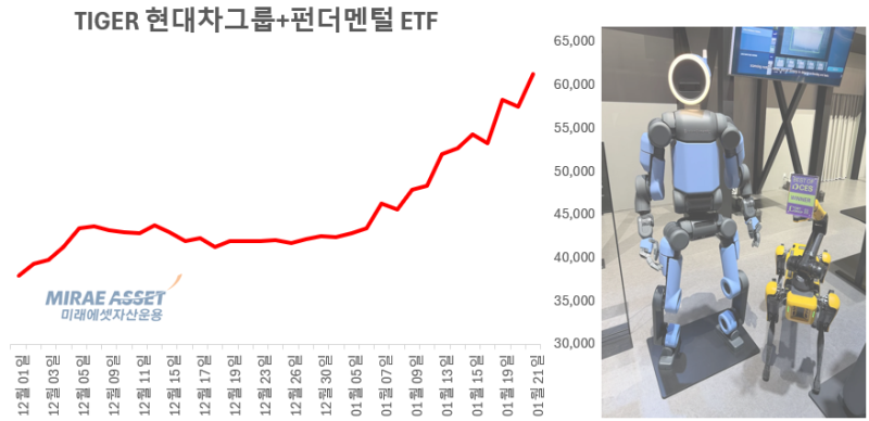 이 같은 전망 속에 시장에서는 관련 ETF로도 투자 수요가 확산되고 있다. 현대차그룹의 성장 모멘텀은 누리면서도 개별 종목 대비 변동성을 낮추려는 투자자들이 늘어난 영향이다. 대표적인 상품으로는 미래에셋자산운용의 ‘TIGER 현대차그룹+펀더멘털’ ETF가 꼽힌다.