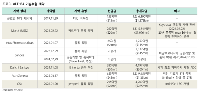 알테오젠의 주가 회복 여부는 결국 추가 기술수출 계약의 빈도와 규모에 달려 있다는 분석이 나왔다. 하나증권은 투자의견 ‘매수’를 유지하면서도, 목표주가는 기존 64만원에서 58만원으로 하향 조정했다. 다만 로열티 구조가 확인되면서 밸류에이션을 보수적으로 손질했을 뿐 성장 스토리는 유지된다는 평가다.