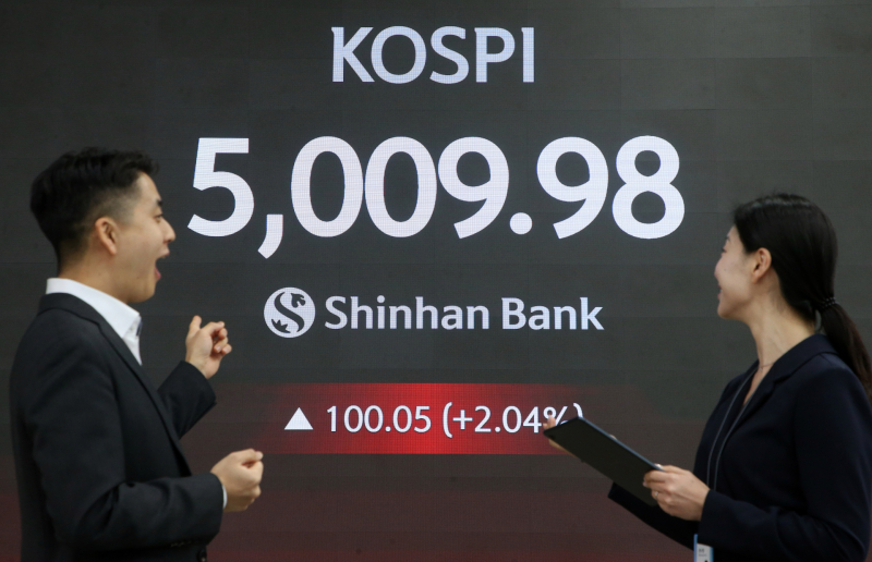 22일 한국거래소에 따르면 오전 9시3분 기준 코스피 지수는 전 거래일 대비 2.01% 급등한 5008.72에 장을 진행하고 있다. 코스피는 전장 대비 1.57% 오른 4987.06으로 장을 출발한 뒤 상승폭을 늘려 오천피를 넘어섰다.