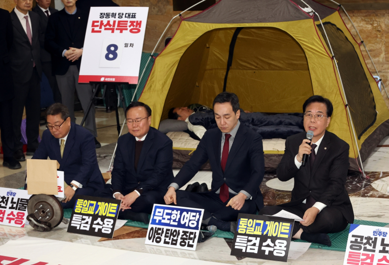 장동혁 국민의힘 대표가 8일째 단식을 이어가는 가운데, 의식이 혼미한 상태인 것으로 알려졌다. 장 대표는 통일교 게이트와 더불어민주당 공천뇌물 사건에 대한 특검 수용을 촉구하며 지난 15일부터 국회 본청 로텐더홀에서 단식 농성을 이어가고 있다.