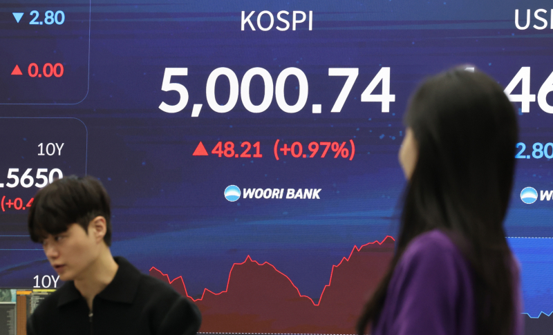 23일 한국거래소(KRX)에 따르면 오전 9시18분 현재 코스피는 전 거래일 대비 1.01%(49.96포인트) 오른 5002.49를 기록 중이다. 이날 4896.02에서 출발한 코스피는 오름폭을 확대하며 5000선 돌파를 지속적으로 시도하고 있다.