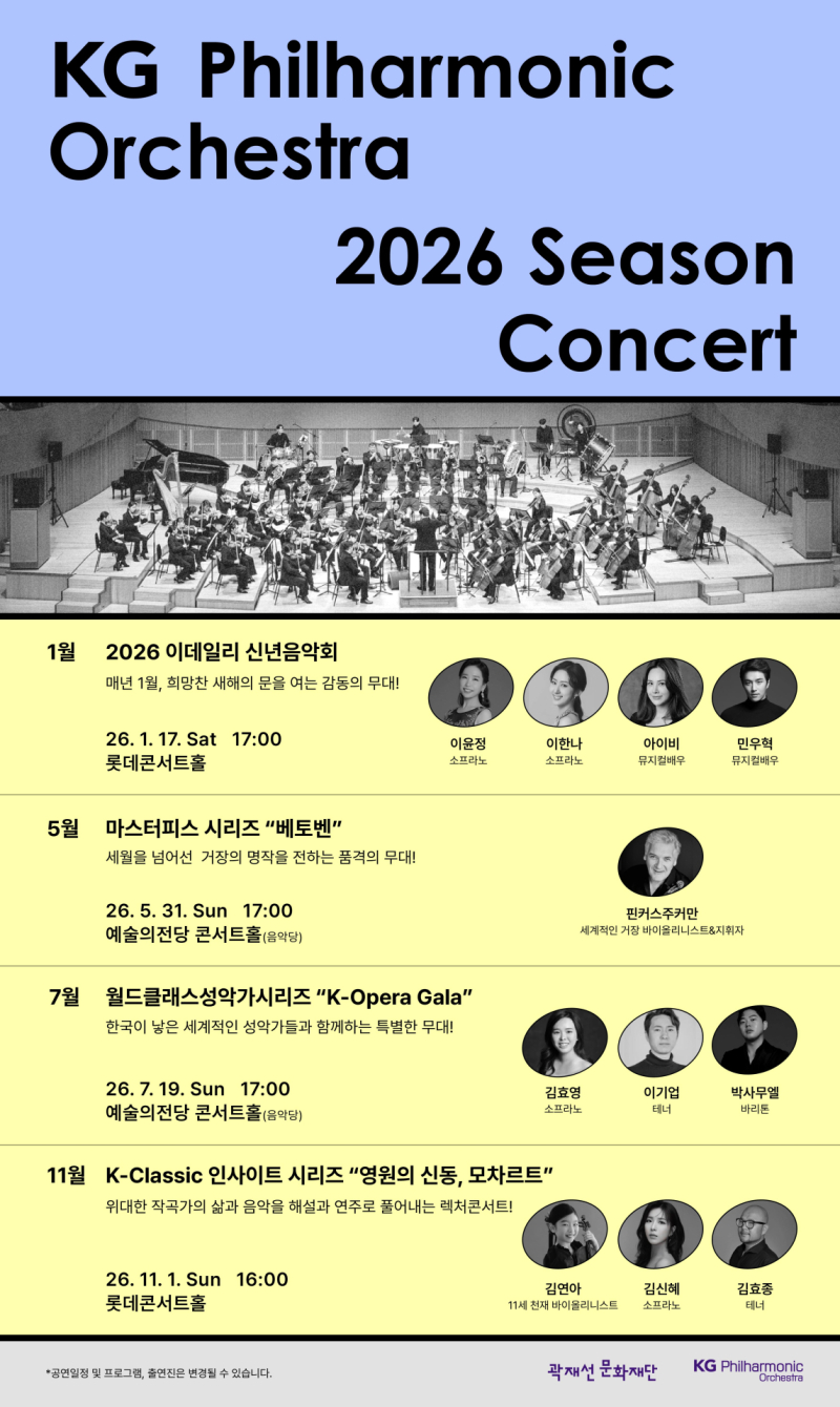 신년음악회의 여운을 이어 KG필하모닉 오케스트라는 5월부터 11월까지 총 세 차례의 정기 공연을 통해 2026년 시즌을 이어간다.
