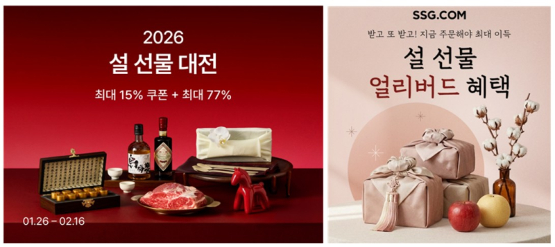 SSG닷컴은 오는 23일까지 ‘설선물 얼리버드’를 운영하며 쿠폰과 적립으로 구매 유인을 키운다. 홍삼, 통조림, 한과 등 가공·건강식품에 적용 가능한 10% 장바구니 쿠폰을 제공하고, 명절상품 구매 금액대에 따라 SSG머니 적립을 내건다. 2월 6일까지는 사전예약 혜택을 이어가며 행사카드 결제 시 이마트몰·신세계몰은 최대 150만원, 신세계백화점몰은 최대 40만원까지 SSG머니 적립을 제공하고, 일부 인기 상품은 최대 50% 할인한다.