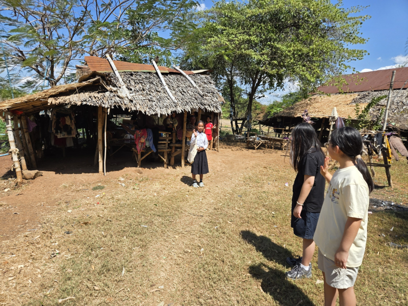 컴퓨터 기증 후 자매는 학교를 나와 또래 캄보디아 친구들이 사는 마을을 방문했다. 그곳에서 목격한 풍경은 적지 않은 충격으로 다가왔다. 말린 바나나잎을 엮어 만든 지붕은 바람이 불면 그대로 날아갈 듯 위태롭게 얹어져 있었다. 환대하는 친구를 따라 들어간 집은 전등조차 없어 어두침침했고, 흙바닥엔 엎드려 책을 보던 흔적들이 남아 있었다.