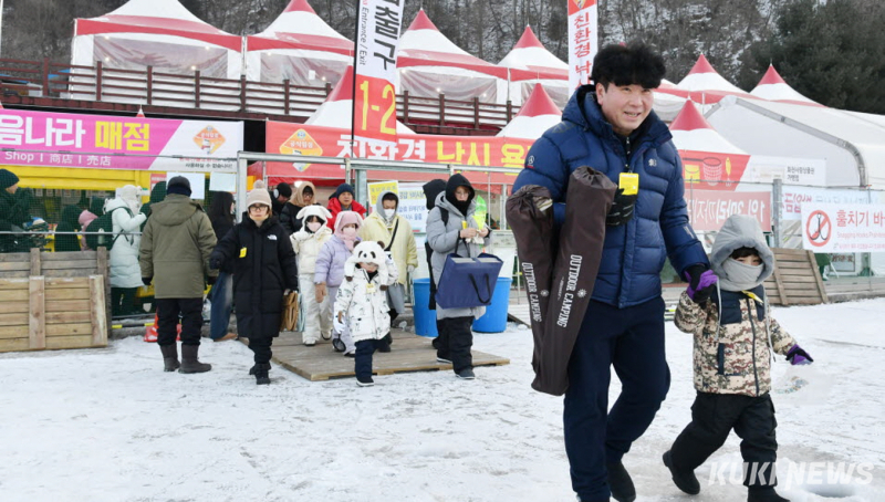 2026 화천산천어축제가 개막 셋째주말인 24일 강원 화천군 화천천 축제장에서 부모와 함께 온 어린이 관광객이 낚시를 즐기고 있다.(화천군 제공)