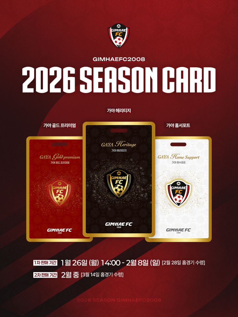 K리그2 정식 참가가 확정된 김해FC2008(이하‘김해FC’)이 2026년 시즌권 판매를 공식 발표했다. 팬들의 성원과 열정을 본격적인 시즌의 에너지원으로 삼기 위해 마련된 이번 티켓은 시즌권 1종, 멤버십 2종으로 구성됐다.