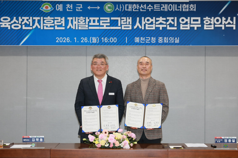 예천군은 26일 군청 중회의실에서 (사)대한선수트레이너협회와 ‘육상전지훈련 재활프로그램 사업 추진을 위한 업무협약(MOU)’을 체결했다고 밝혔다.