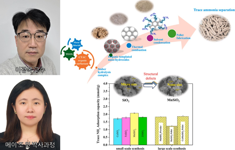 이광복 교수 연구팀은 이번 연구에서 양이온 템플릿을 활용해 전이금속 산화물이 결합된 실리카 나노 흡착제를 개발했다. 이 신소재는 수소 흐름 속에서 잔류 암모니아만을 선택적으로 포집해 제거하며, 여러 차례 반복 사용해도 성능이 유지되는 우수한 안정성을 보였다.
