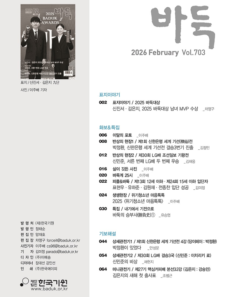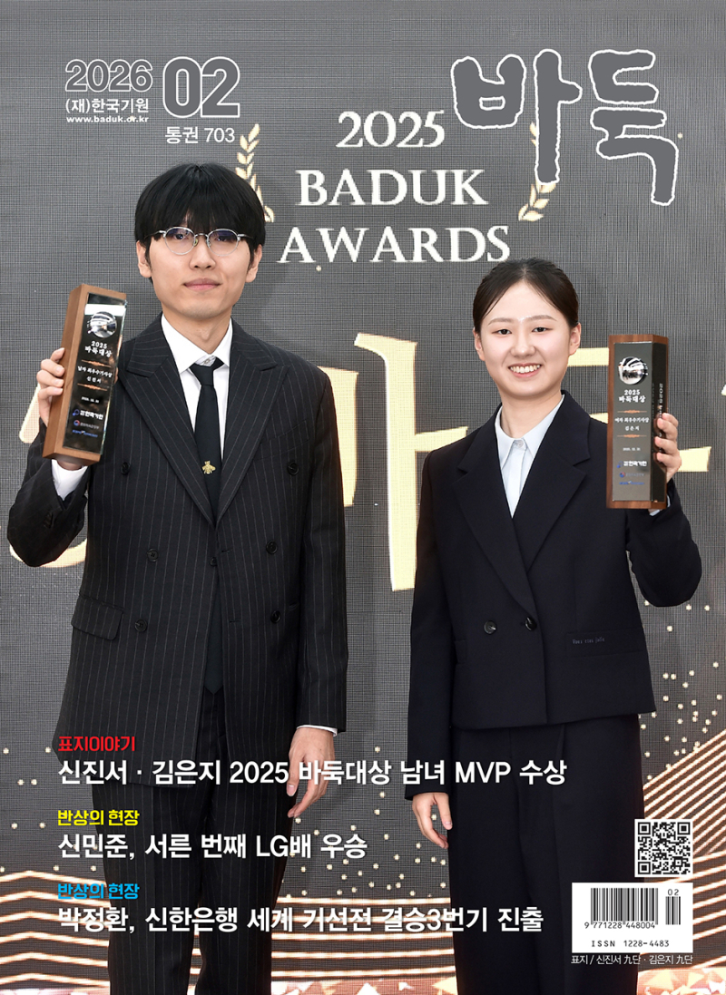 이번 호 표지는 신진서 9단과 김은지 9단이 장식했다. 2025년 바둑계 한 해를 총정리하는 바둑대상에서 신진서 9단과 김은지 9단이 각각 남자와 여자 최우수기사상(MVP) 영예를 안았다. 다양한 시상 부문을 선보이며 풍성해진 2025 바둑대상. 그 수상의 순간들을 ‘표지이야기’에서 전한다.