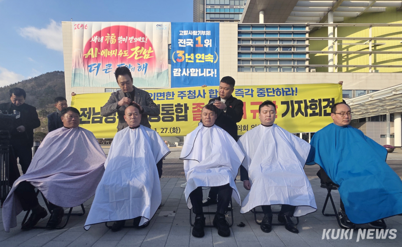 이호성 의장과 박쌍배‧임현수‧김봉성‧임윤택 의원 등 5명은 27일 오후 도 청사 앞에서 기자회견을 열고, 정부와 국회는 전남·광주 행정통합 입법 과정에서 전남도청을 통합 광역행정의 주축으로 명문화할 것도 요구했다.