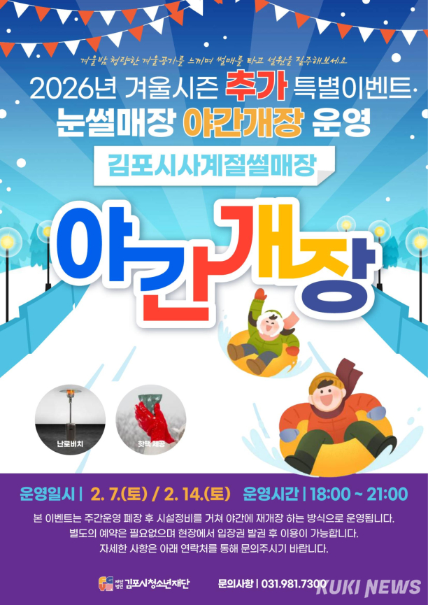 경기 김포시는 겨울철 시민 여가문화 확대를 위해 김포시사계절썰매장에서 겨울시즌 야간개장 프로그램 ‘눈 내리는 은빛 썰매장’을 운영한다고 28일 밝혔다.