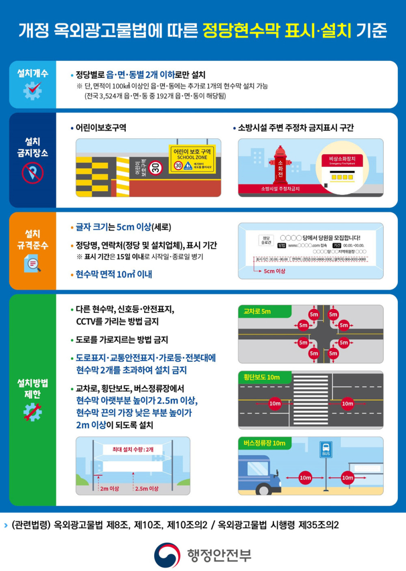 개정된 옥외광고물법에 따르면 정당현수막은 정당별로 읍‧면‧동별 2개 이하로만 설치해야 한다. 단, 면적이 100㎢ 이상인 읍‧면‧동에는 1개를 추가 설치할 수 있다.