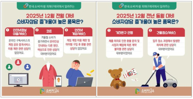 이중 코트 품목에 대한 소비자상담은 겨울철 소비가 증가하면서 온라인상 안내와는 다른 원단, 색상으로 인한 상담이 대부분이었다. 인터넷게임서비스는 게임 계정 이용 제한 및 아이템 구입 후 대금 환급 관련 상담이 많았다.