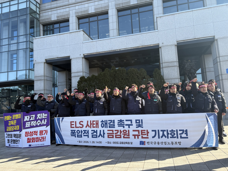 28일 금융노조는 서울 여의도 금융감독원 앞에서 ‘ELS 사태 해결 촉구 및 폭압적 검사 금감원 규탄 기자회견’을 열었다. 윤석구 금융노조 제28대 위원장 당선인은 “ELS 과징금 산정 기준은 법의 취지와 비례성 원칙을 넘어 과도하게 확장돼 있다”며 “이 기준이 그대로 굳어질 경우 금융산업 전반의 위축과 고용 불안, 소비자 선택권 축소로 이어질 수 있다”고 밝혔다.