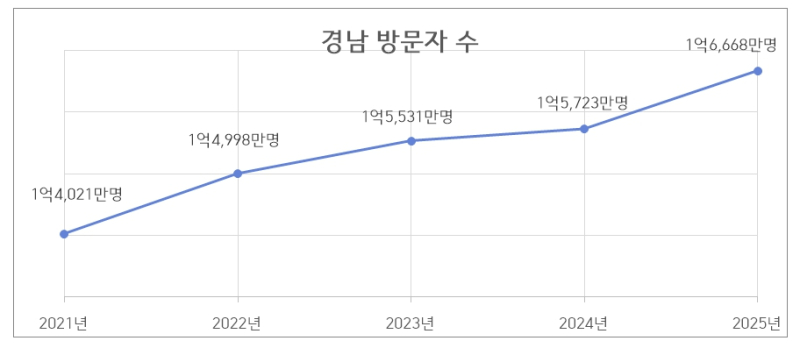 경상남도가 한국관광데이터랩의 이동통신·신용카드 빅데이터 분석 결과, 2025년 경남 방문자 수가 1억6668만 명으로 집계됐다. 이는 2024년(1억5723만명)보다 6.0% 증가한 수치로 전국 17개 시·도의 평균 증가율(5.8%)을 웃돌았다.