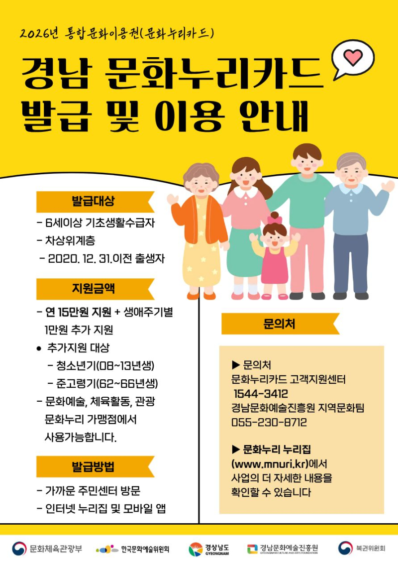 경남도와 경남문화예술진흥원(원장 김종부)이 다음달 2일부터 문화누리카드 발급을 시작한다.