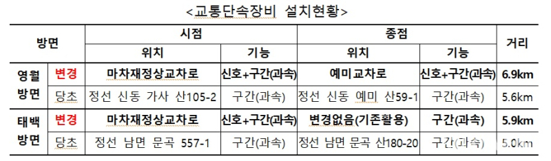 이번에 설치된 교통단속 장비는 교통사고 다발구간(국도 38호선 마차재) 내로 단속구간을 재조정(영월방면 6.9km·태백방면 5.9km)했다.