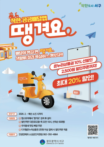 서구는 광주 자치구 최초로 추진하는 이번 사업을 통해 주민의 외식비 부담을 완화하고, 소상공인의 배달 중개수수료 부담을 낮춰 지역경제 선순환을 도모할 계획이다. ‘땡겨요’는 중개수수료가 2%대로 낮아 소상공인 부담이 적은 민관협력형 플랫폼이다.