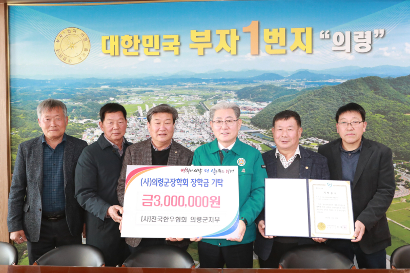 (사)전국한우협회 의령군지부가 학생들의 안정적인 학습환경 조성을 위해 (사)의령군장학회에 장학금 300만원을 기탁했다.