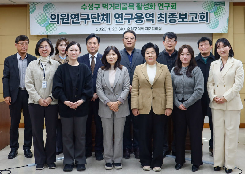 수성구의회 의원연구단체인 ‘수성구 먹거리골목 활성화 연구회’는 28일 의회 2층 회의실에서 ‘수성구 먹거리골목 활성화 모델 마련’을 주제로 연구용역 최종보고회를 열었다.