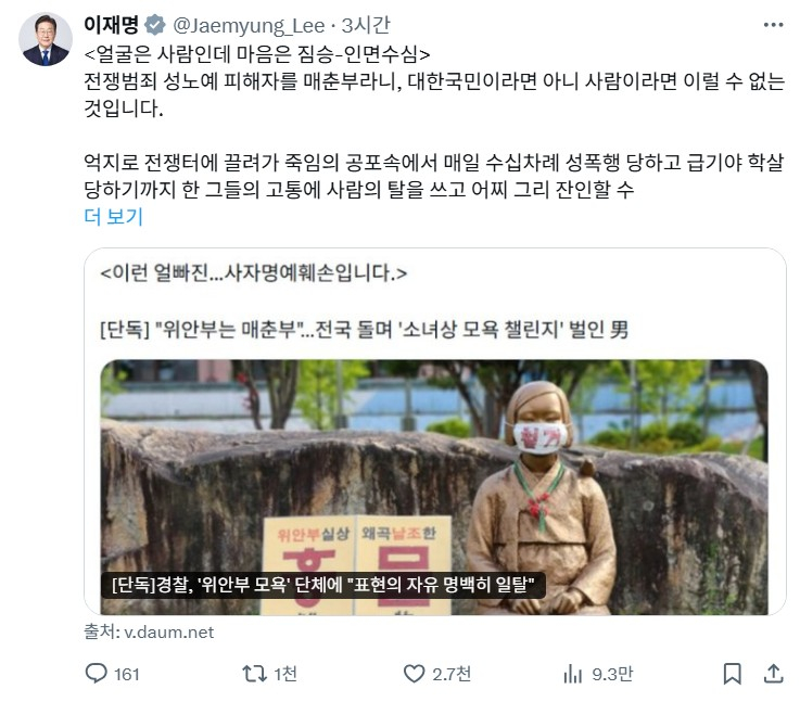 이어 “억울한 전쟁범죄 피해자들을 동정하지는 못할망정, 수년간 전국을 쏘다니며 매춘부라 모욕하는 그 열성과 비용, 시간은 어디서 난 것이냐”고 반문했다.